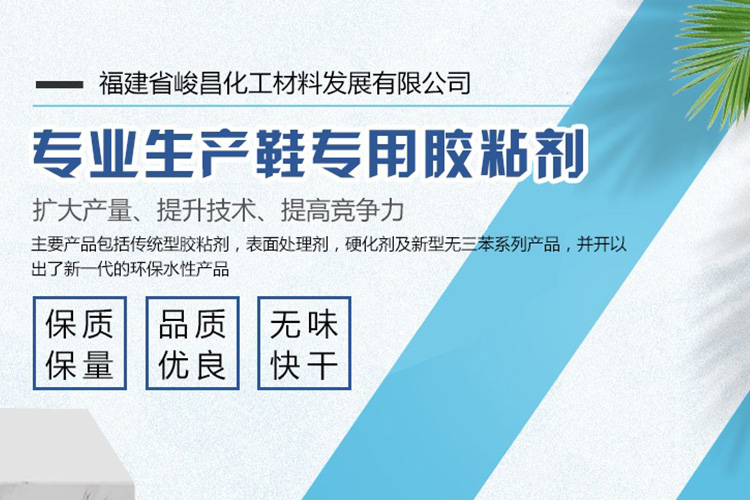 福建省峻昌化工材料發(fā)展有限公司總部設(shè)在中國鞋鄉(xiāng)——晉江。為更好、更方便服務(wù)廣大客戶,我司在廣東江門及福建均設(shè)有先進(jìn)的PU膠生產(chǎn)基地,歡迎廣大同行前來我司灌裝或批發(fā)銷售。公司是一家中外合資,面向亞太地區(qū)從事研究,生產(chǎn)銷售鞋用粘膠10多年的專業(yè)公司。從國外引進(jìn)生產(chǎn)能力為數(shù)萬噸的全套先進(jìn)生產(chǎn),檢驗設(shè)備,與德國Bayer,日本DENKA及美國,西班牙等其它海外公司有著密切的原材料及技術(shù)合作。公司主要產(chǎn)品包括傳統(tǒng)型膠粘劑,表面處理劑,硬化劑及新型無三苯系列產(chǎn)品,并開以出了新一代的環(huán)保水性產(chǎn)品。供應(yīng)國內(nèi)外鞋業(yè),手提箱包及建筑工程單位使用。公司始終保持產(chǎn)品的良好品質(zhì)及專業(yè)特性,并倍受廣大客戶好評。